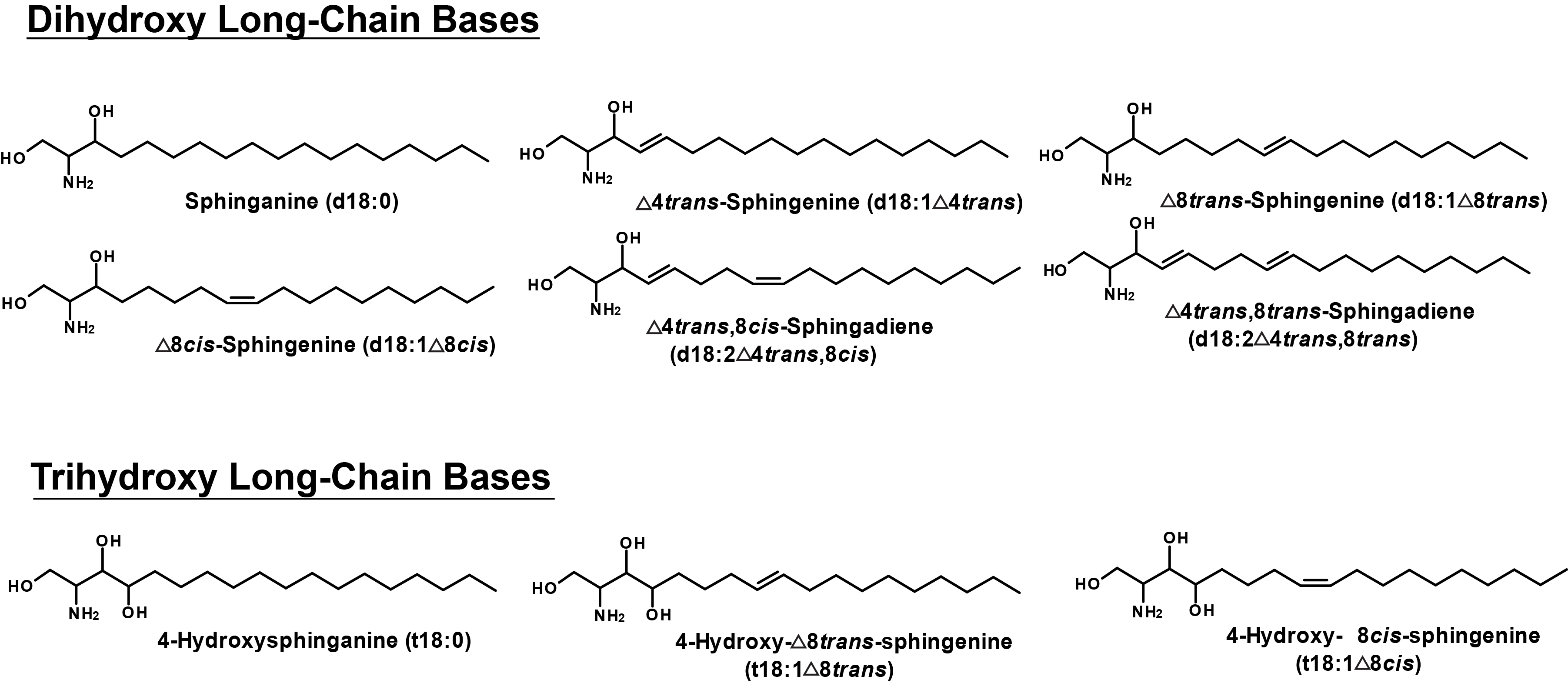 In plants, LCBs typically have chain lengths of 18 carbon atoms and can contain double bonds in the Δ4 or Δ8 positions. The Δ4 double bond is found only in the trans configuration, while the Δ8 double bond can be found in either the trans or cis configurations. Following its initial synthesis, a LCB has two hydroxyl groups at the C-1 and C-3 carbons (Lynch and Dunn 2004; Chen et al. 2010). These LCBs are referred to as dihydroxy LCBs. A third hydroxyl group can be enzymatically added at the C-4 carbon to form a trihydroxy LCB. In the short-hand nomenclature, a dihydroxy LCB with 18 carbons and 1 double bond is referred to as “d18:1”, and a trihydroxy LCB with 18 carbons and 1 double bond is referred to as “t18:1”. LCBs can be phosphorylated at the C-1 position to form LCB-phosphates (LCB-P). Free LCBs and their phosphorylated forms are typically in low abundance in plant cells (Markham and Jaworski 2007; Markham et al. 2006). Instead, the majority of LCBs are found linked to fatty acids in ceramides.