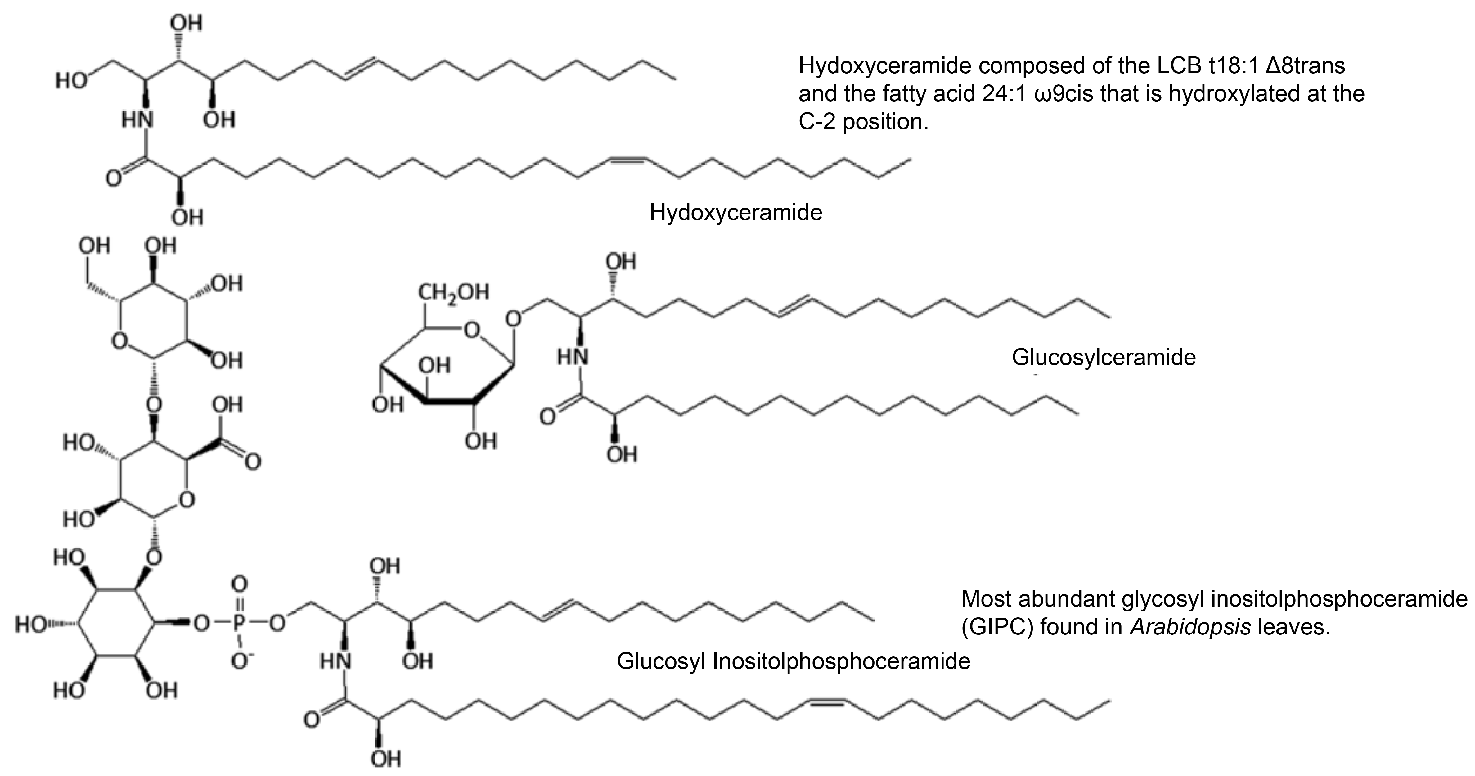 The polar head group of ceramides is attached at its C-1 position and can be a phosphate residue or a variety of sugar residues (Chen et al. 2010). The latter are referred to as glycosphingolipids. The simplest glycosphingolipid in plants is the glucosylceramide (GlcCer) with a single glucose residue and comprises approximately one-third of the glycosphingolipids of Arabidopsis leaves (Markham and Jaworski 2007; Markham et al. 2006). The most abundant glycosphingolipid in plants contains an inositol phosphate bound to the ceramide with up to seven additional hexose and pentose residues (Cacas et al. 2013). These molecules are referred to as glycosyl inositolphosphoceramides or GIPCs and comprise approximately two-thirds of the glycosphingolipids of Arabidopsis leaves (Markham and Jaworski 2007; Markham et al. 2006). The quantitative significance of GIPCs in plants was overlooked for many years due to the difficulty in their extraction using standard lipid analytical protocols because of the high polarity of their glycosylated head groups.